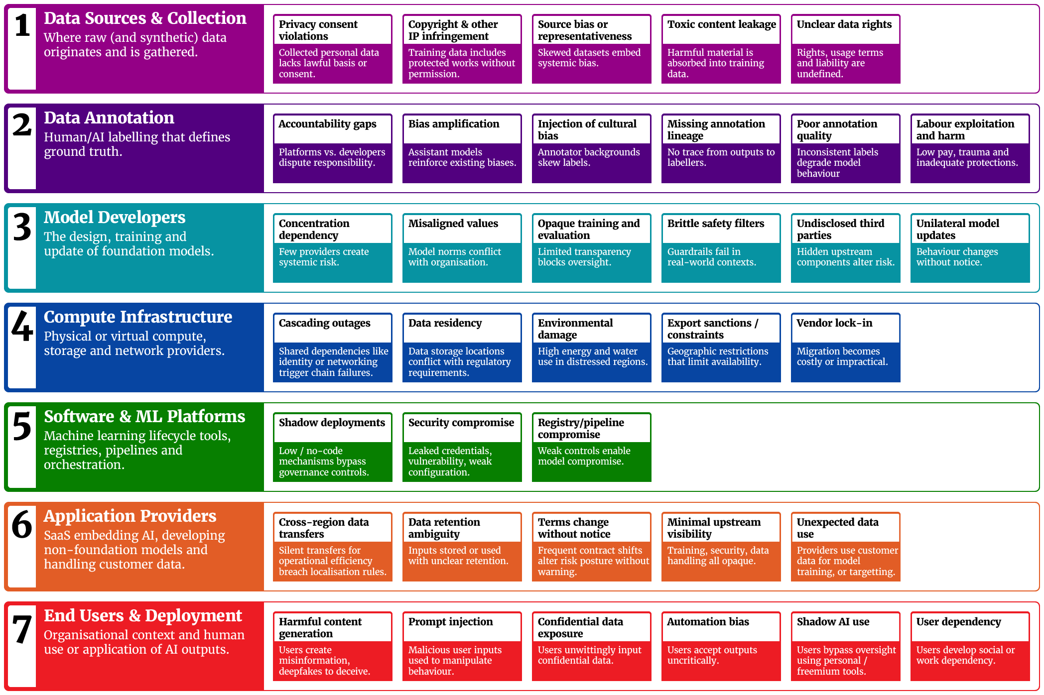 I’ve found it’s more useful to think of the AI supply chain as working through seven interconnected layers, where data flows from collection through annotation to model development, then via cloud infrastructure and software platforms to applications, finally reaching end users. This seemingly linear process masks a web of dependencies where companies often operate across multiple layers simultaneously. Risks emerge at each layer of the supply chain, and could escalate through multiple layers all the way from data sources at Layer 1 to usage at Layer 7. It’s much less about provider/deployer and more about depencies in both directions up and down the seven layers. And at each layer risks emerge, though their impact may be felt far away.